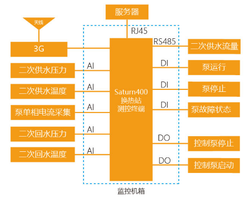 一次網監測由Saturn400換熱站監測終端負責一次回路數據的采集與執行,并由Saturn400換熱站監測終端負責上、下通訊,通過RJ45端口或3G與換熱站監控中心、公司調度中心進行通訊。其功能框圖見下圖所示: